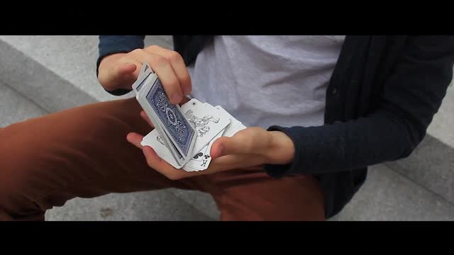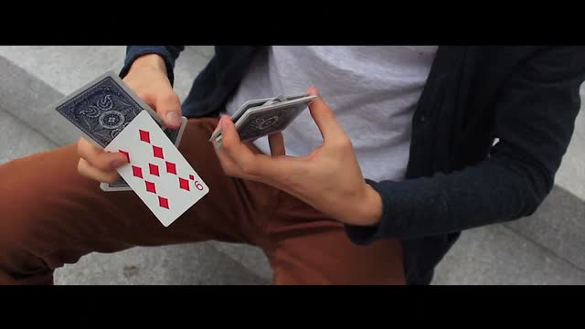 The (H) stands for Helium :: Difficulty - hard :: + KeyFlip (Card Shot) :: Difficulty - hard :: Two versions of Helium are available, Helium & Helium [2.0]. Helium, ends with a fast thumb-bring-card-back-to-the-deck move in which Helium [2.0] ends with a display keeping two cards face-up on your thumbs in balance. Both Flourishes including KeyFlip, a one-handed card shot.